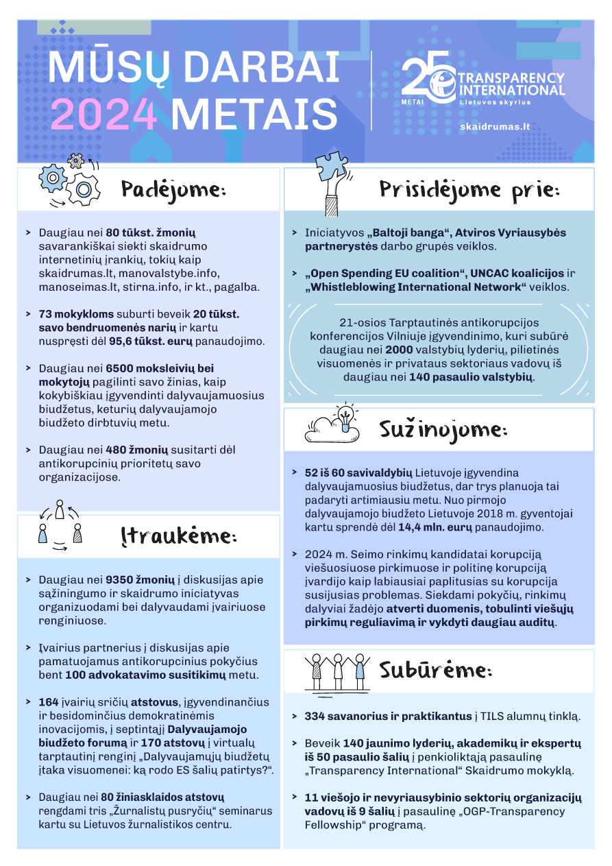 Pristatome svarbiausius savo darbus 2024 metais. Džiaugiamės, kad pernai prisidėjome prie 21-osios Tarptautinės antikorupcijos konferencijos Vilniuje įgyvendinimo bei padėjome daugiau nei 109 tūkst. žmonių savarankiškai siekti skaidrumo, o 73 mokykloms išbandyti dalyvaujamuosius biudžetus. Detalias mūsų ankstesnių metų veiklos ir finansines ataskaitas galite rasti čia.